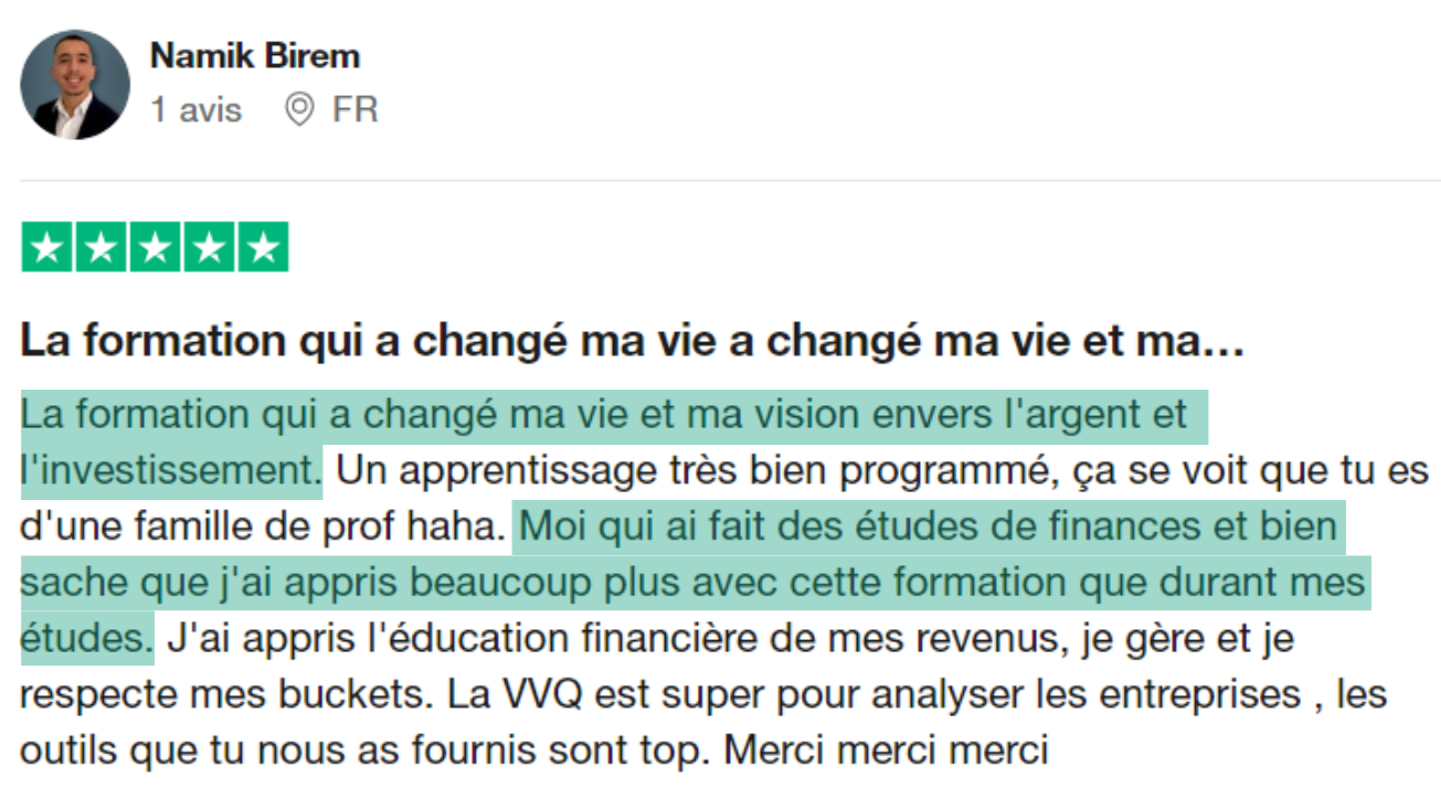 "Cette formation vaut vraiment le coup. On reprend tous les mécanismes de l'économie en général, les ETF, et la sélection d'entreprises, le calcul des ratios, etc. Tout est sourcé, c'est rassurant.