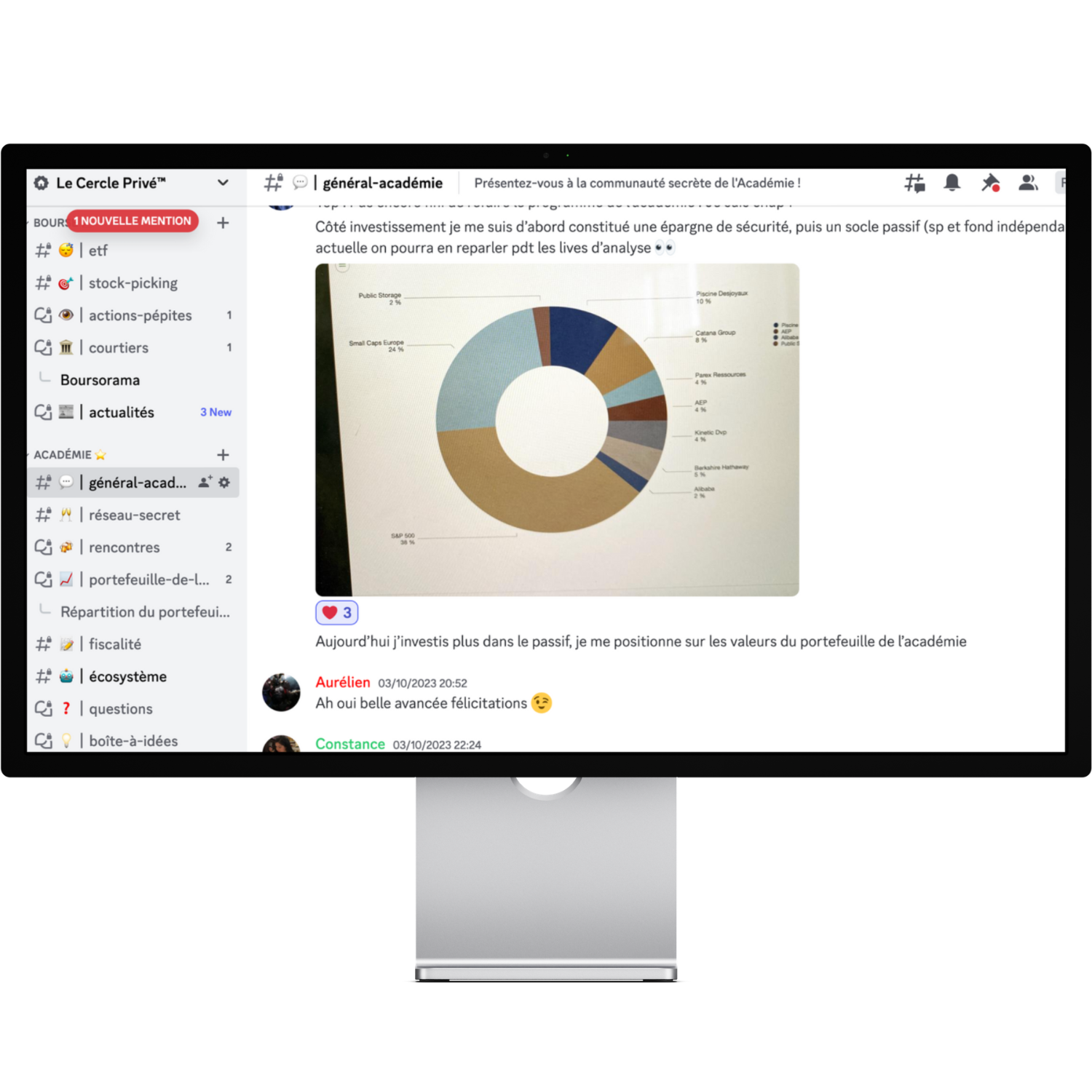 Vous aurez accès à un serveur structuré pour poser toutes vos questions thématiques (ETF, stock-picking, courtiers, fiscalité, immobilier...), mais aussi pourrez faire des rencontres et proposer vos idées d'amélioration de l'Académie.