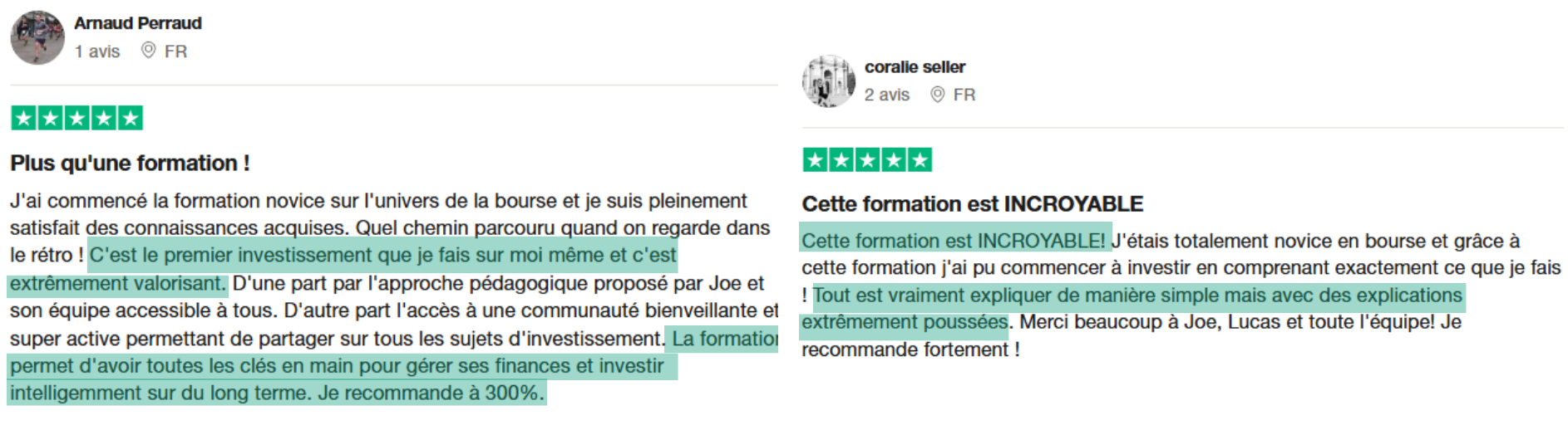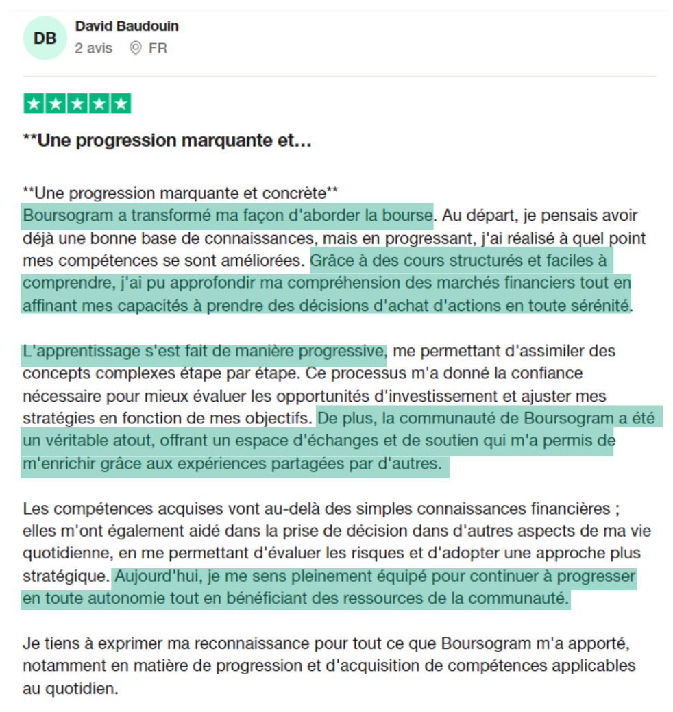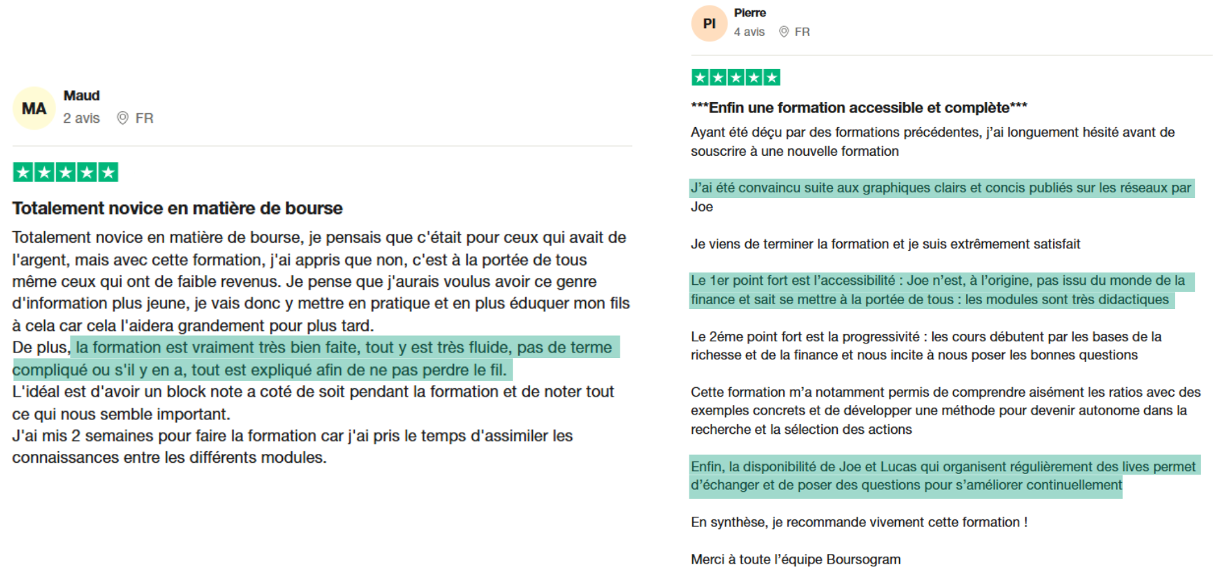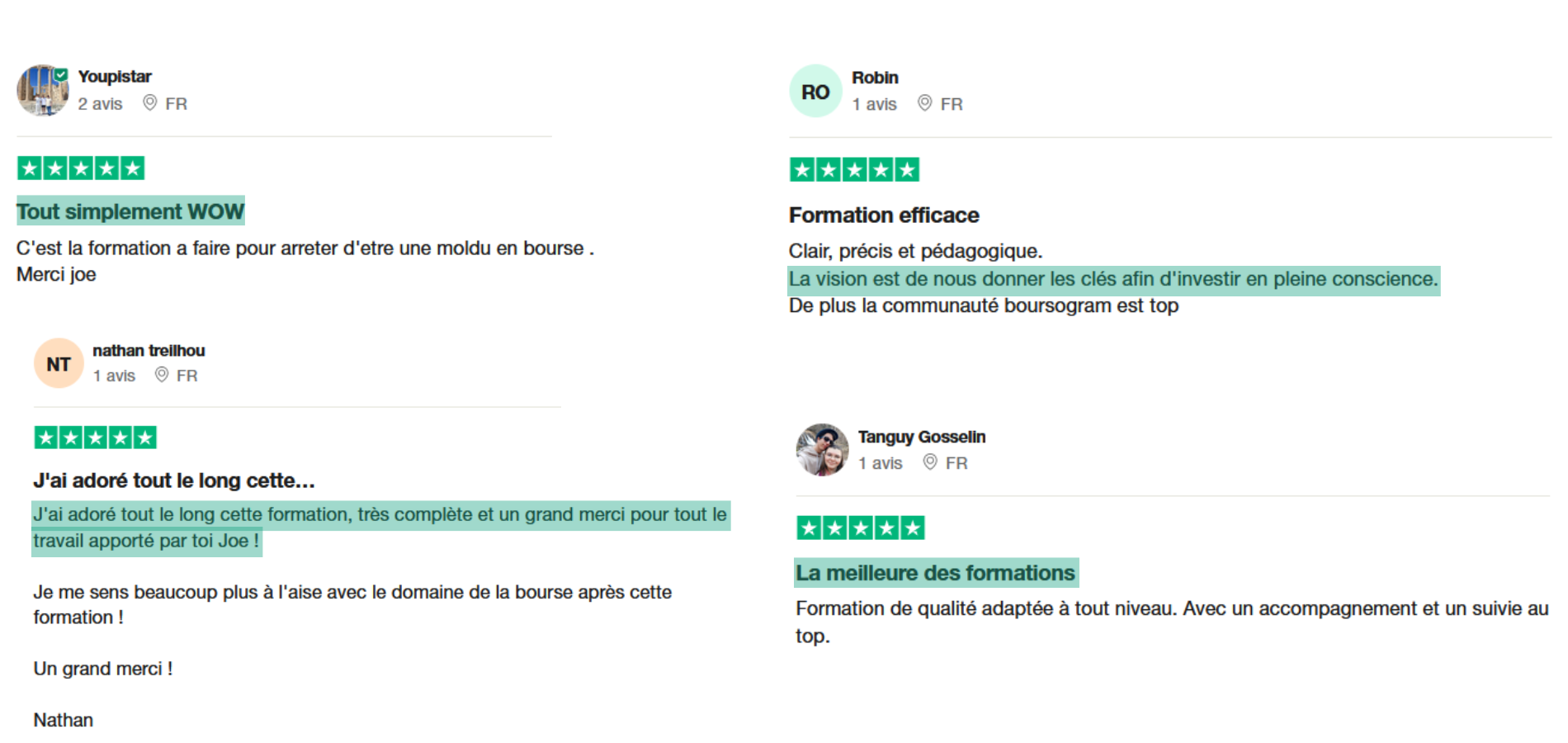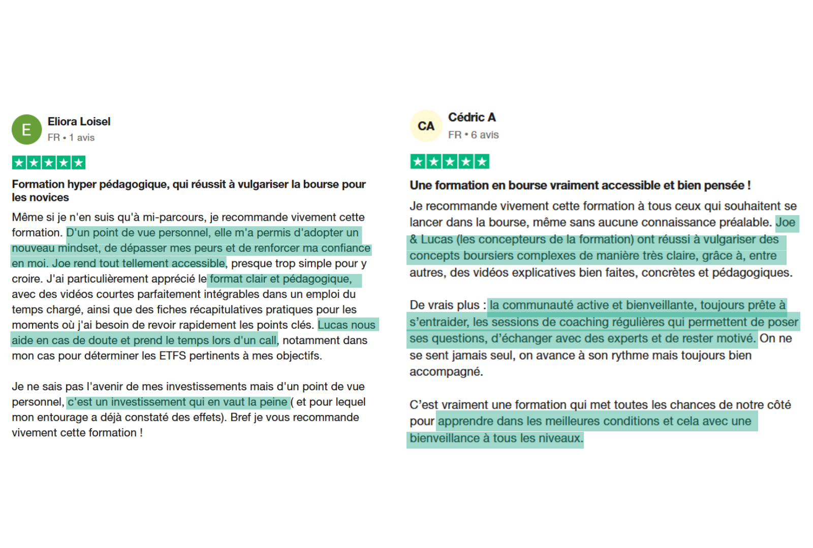 "Cette formation vaut vraiment le coup. On reprend tous les mécanismes de l'économie en général, les ETF, et la sélection d'entreprises, le calcul des ratios, etc. Tout est sourcé, c'est rassurant.