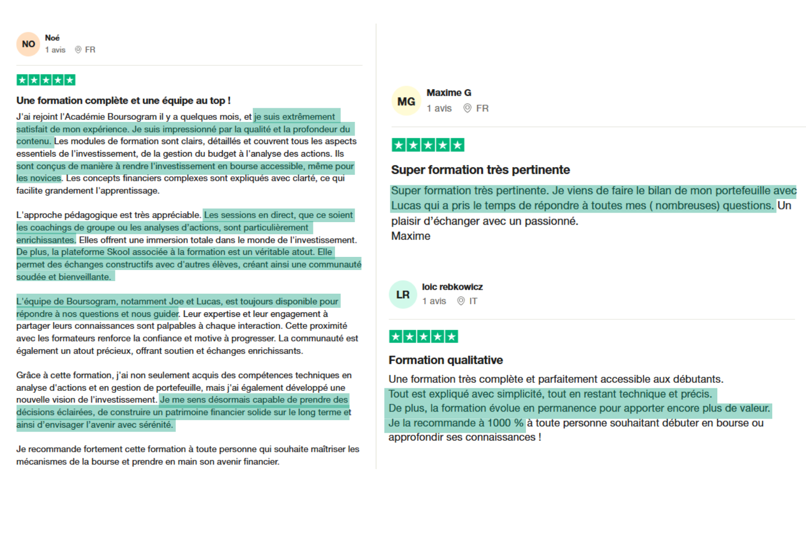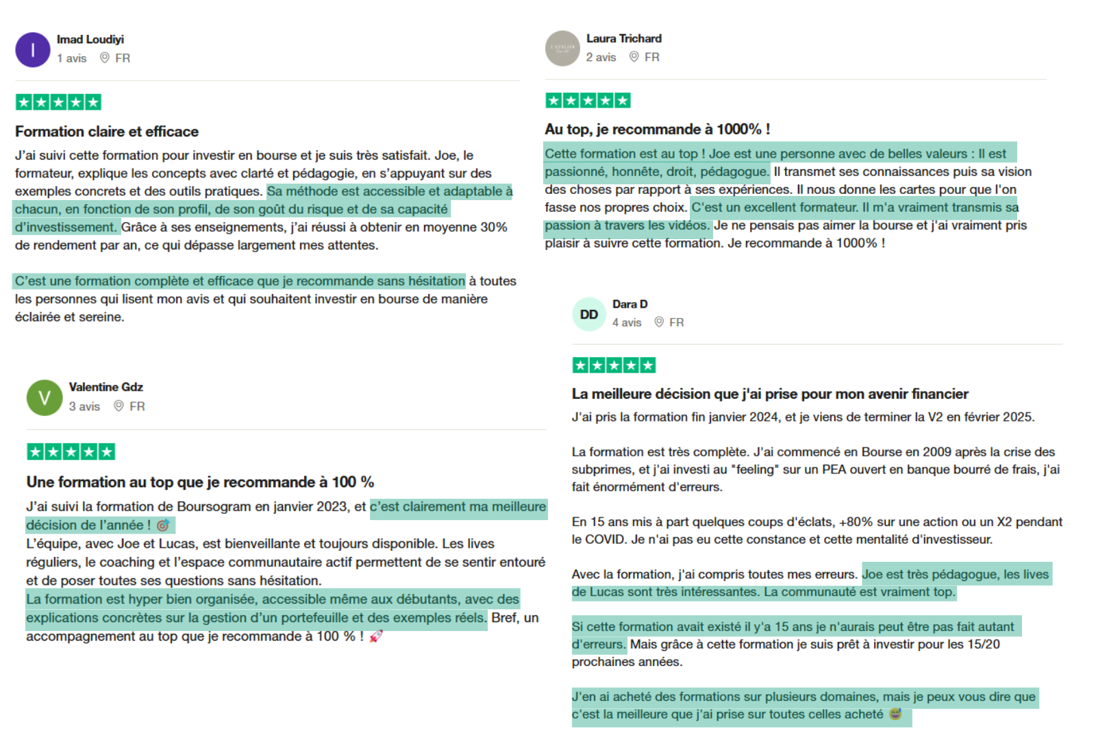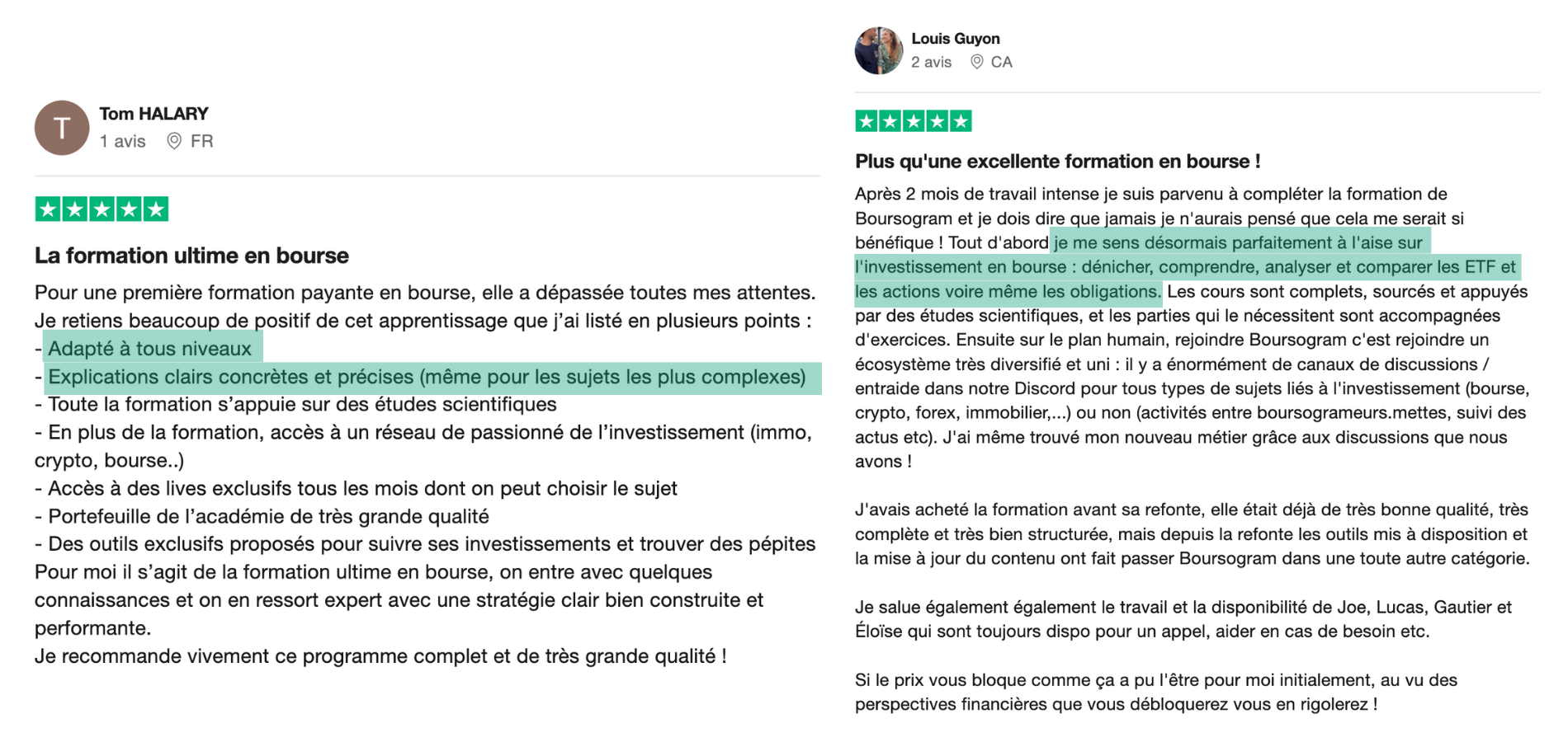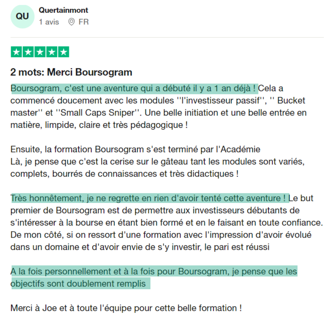 "Cette formation vaut vraiment le coup. On reprend tous les mécanismes de l'économie en général, les ETF, et la sélection d'entreprises, le calcul des ratios, etc. Tout est sourcé, c'est rassurant.