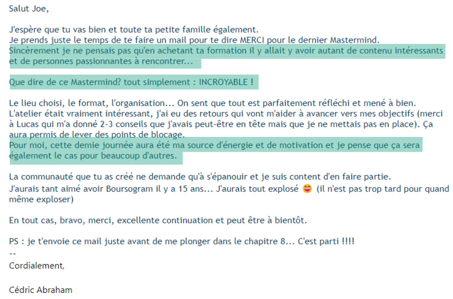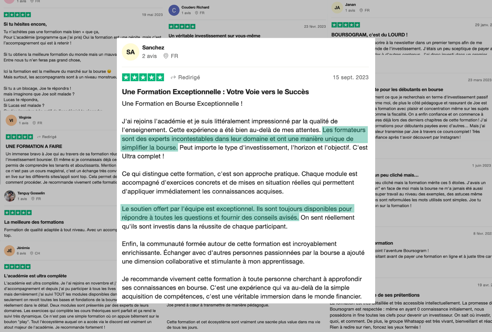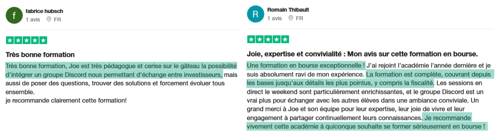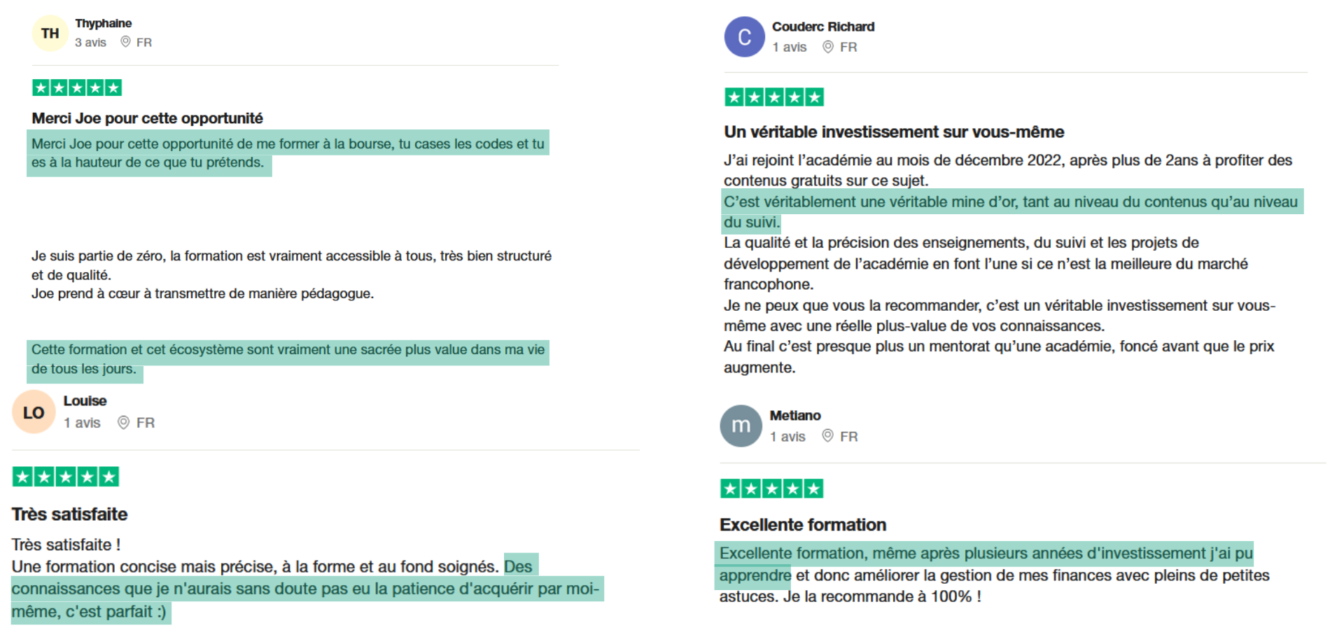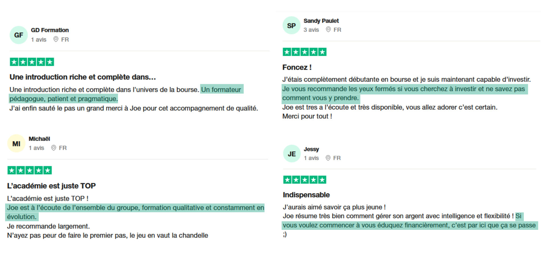 "Joe répond à toutes nos questions, on échange tous ensemble dans le groupe de l'Académie, sur des tips, des actions, des stratégies, etc. Le groupe m'a énormément apporté. Si vous cherchez un groupe dans lequel échanger avec les mêmes valeurs, vous êtes au bon endroit !"