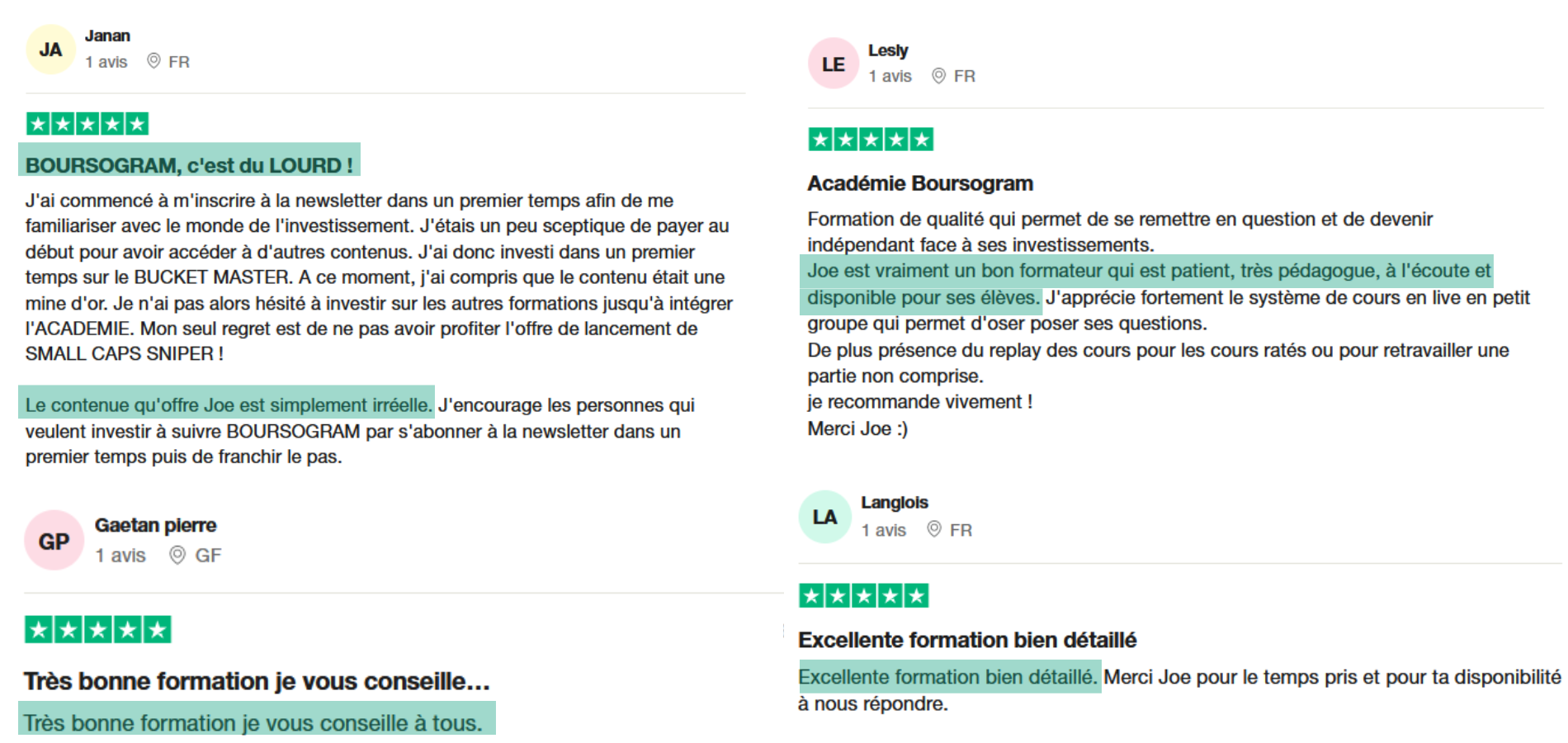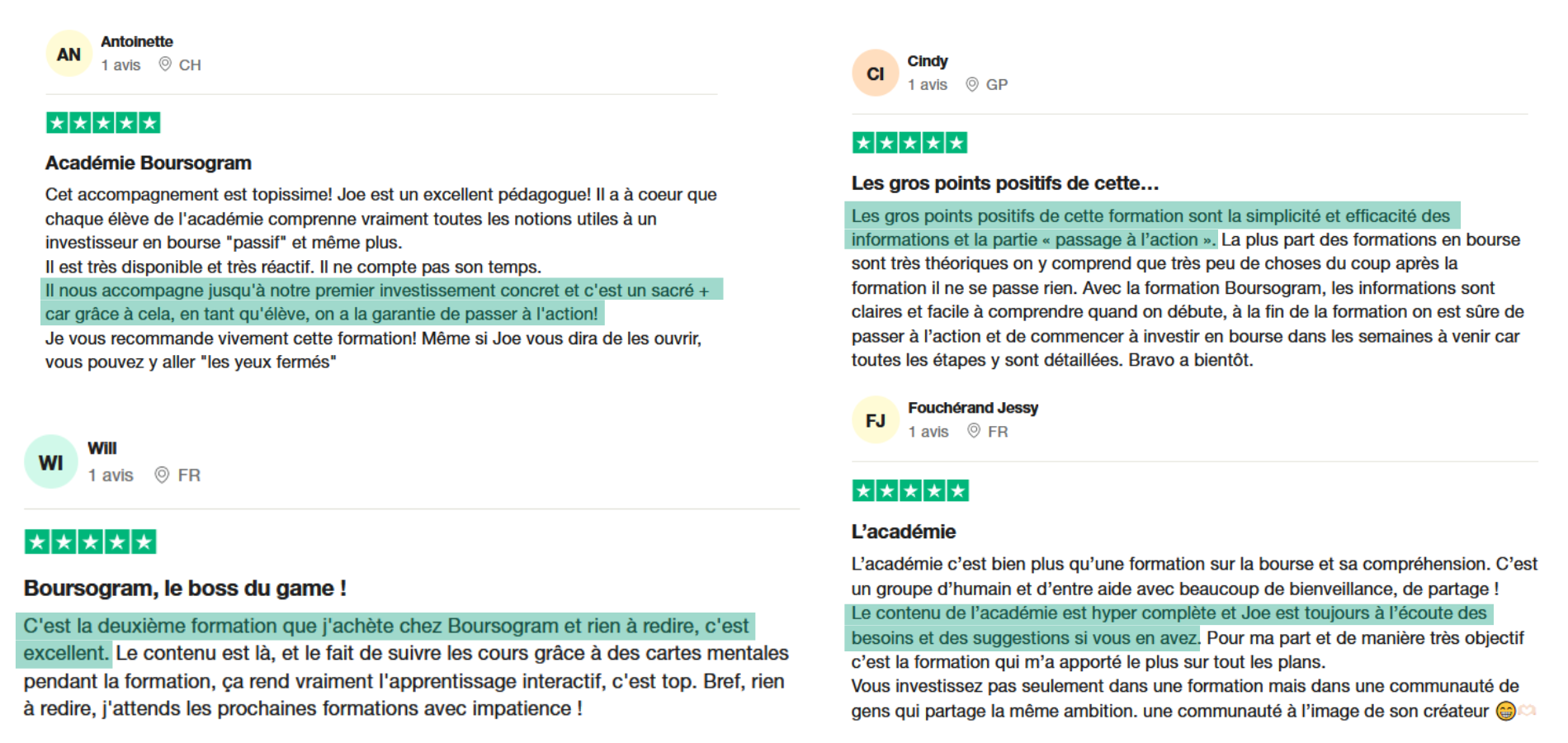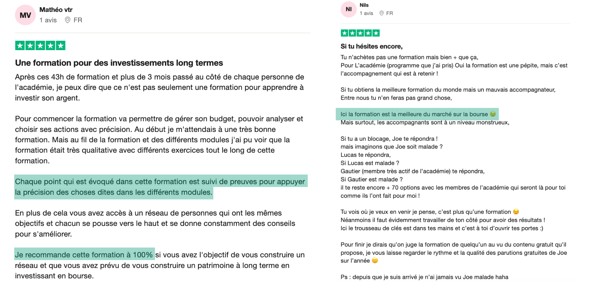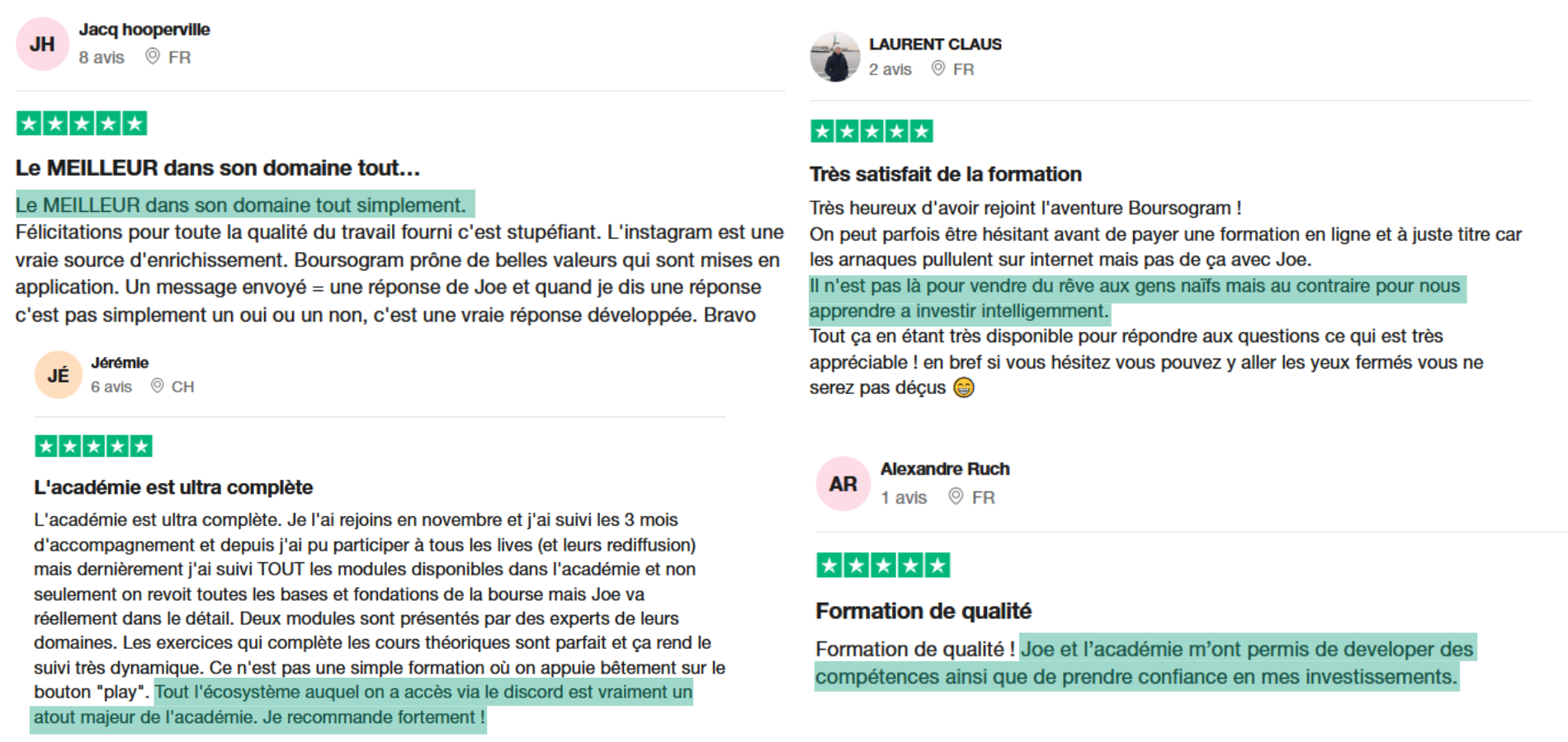 "Joe répond à toutes nos questions, on échange tous ensemble dans le groupe de l'Académie, sur des tips, des actions, des stratégies, etc. Le groupe m'a énormément apporté. Si vous cherchez un groupe dans lequel échanger avec les mêmes valeurs, vous êtes au bon endroit !"