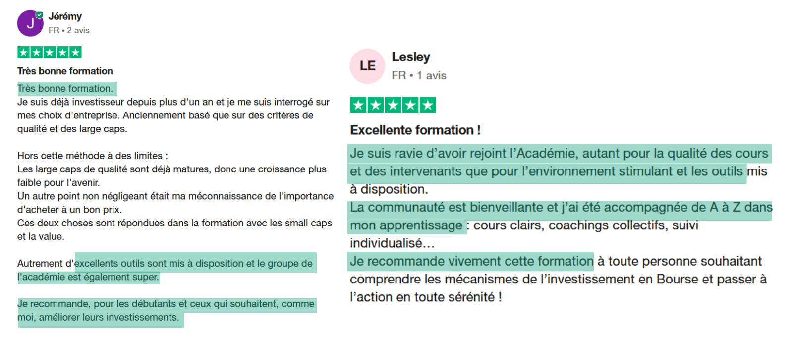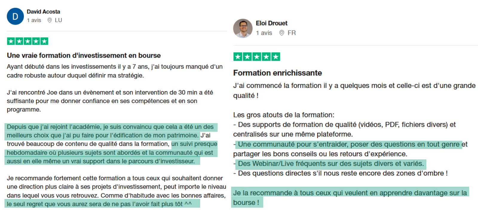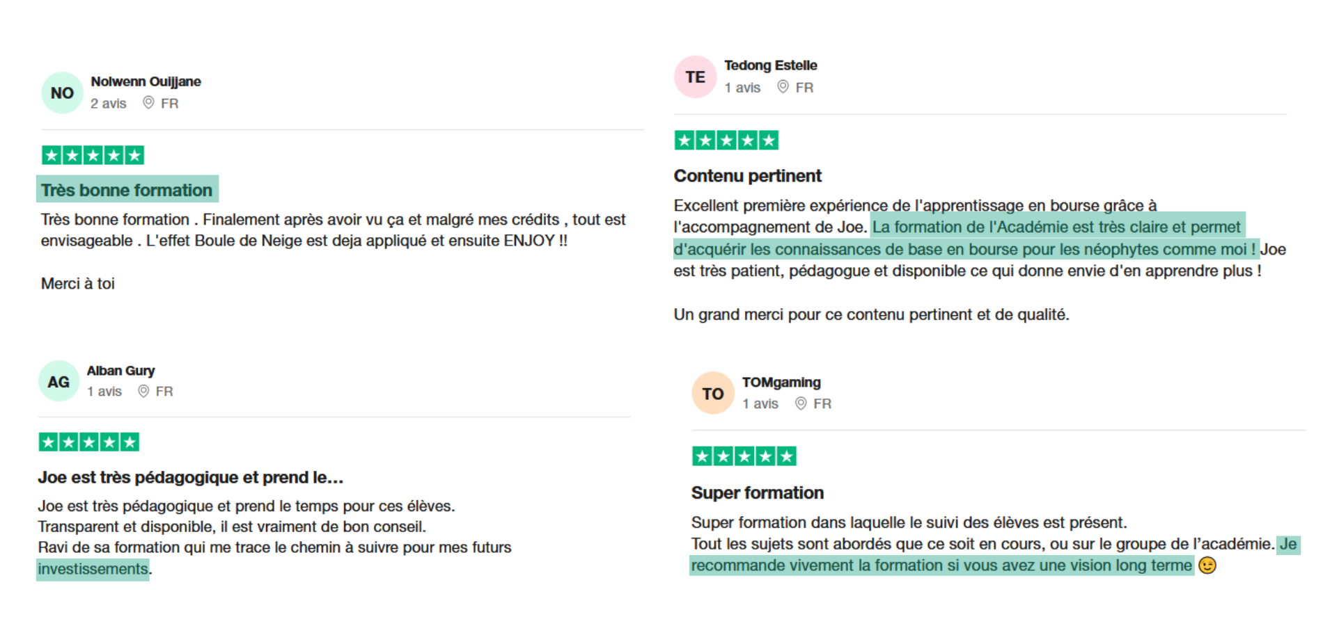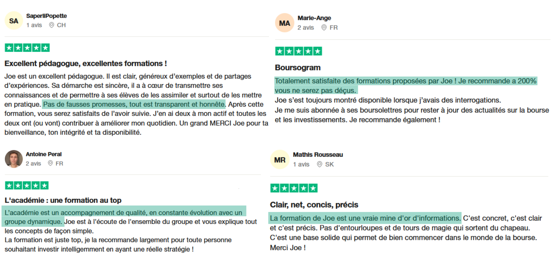 "Je suis extrêmement satisfaite de l'Académie. Joe est très pédagogue et de bon conseil. Il prend le temps de répondre à toutes mes interrogations. Grâce à la formation, j'ai pu acheter mes premières actions et honnêtement, je vous recommande à 200% d'intégrer l'Académie, vous ne serez pas déçu !"